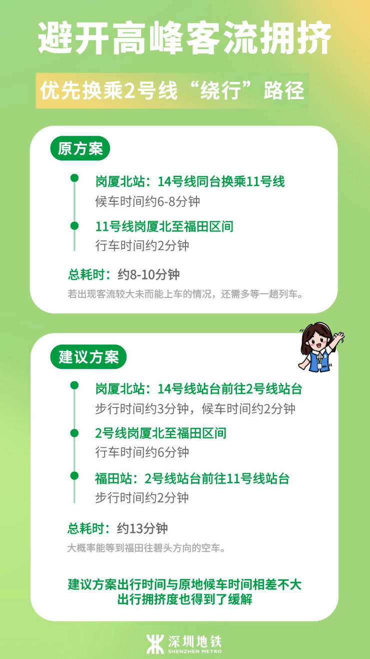 高峰期在岗厦北站、福田站优先换乘2号线,再选择11号线或14号线的出行路径,不仅可以避开两座车站的排队拥挤,出行也更为安全舒适哦~