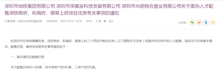 4月1日,深圳住建局发布深铁熙府、和瑞府、御棠上府三个可售型人才房的配售公告。线上申请认购时间为:2024年4月2日9:00至2024年4月11日18:00。