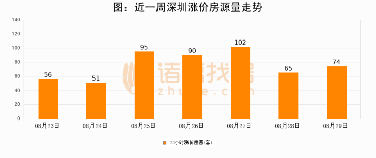 根据诸葛找房数据显示,深圳24小时涨价房源量为74套,较08月28日增加9套,环比上涨13.8%。与此同时,涨价房源占比小幅扩大,业主信心有所提升。