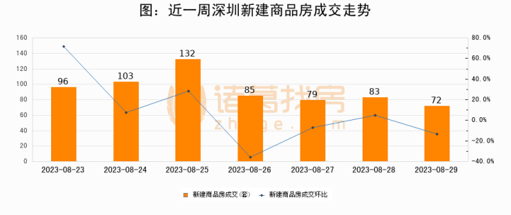 根据深圳市住房和城乡建设局数据显示,2023年08月29日深圳新建商品房成交72套,较昨日减少11套,环比下降13.2%