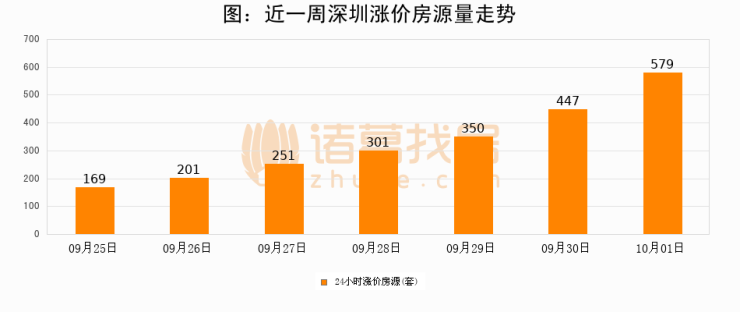 根据诸葛找房数据显示,深圳24小时涨价房源量为579套,较09月30日增加132套,环比上涨29.5%。与此同时,涨价房源占比小幅扩大,业主信心有所提升。