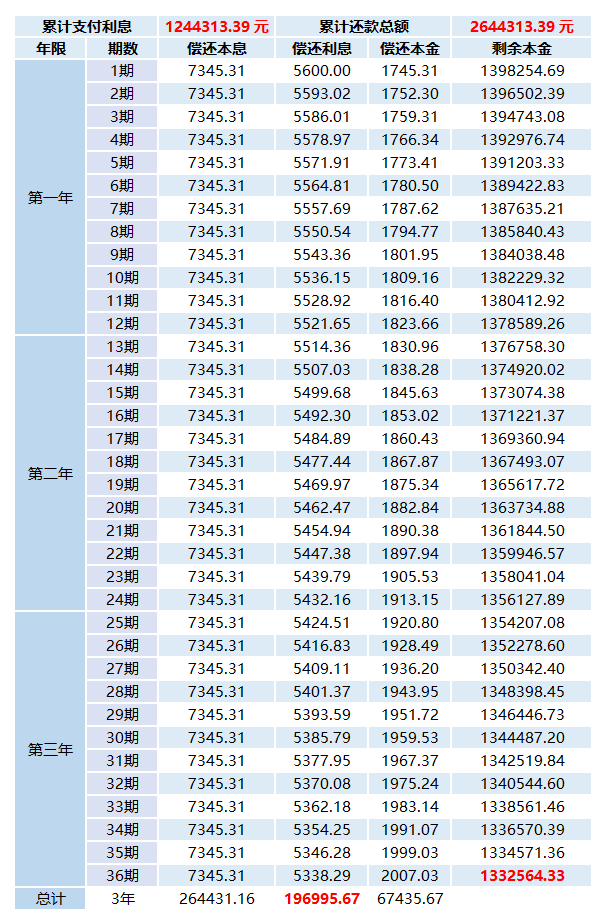 剩下的140万全部向商业银行做按揭贷款,如果是压力较小的等额本息,那么具体的贷款明细如下: