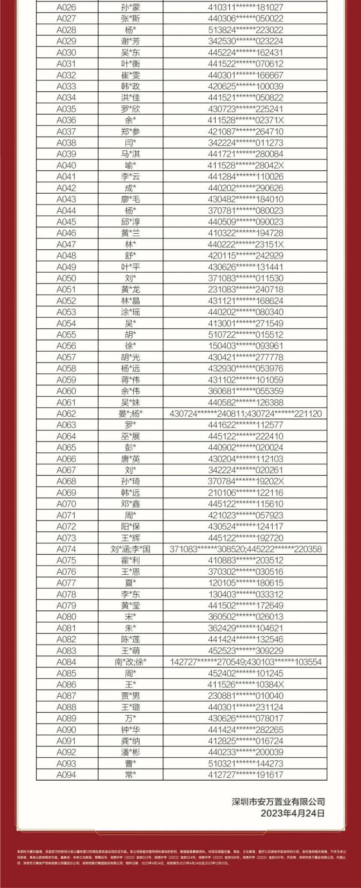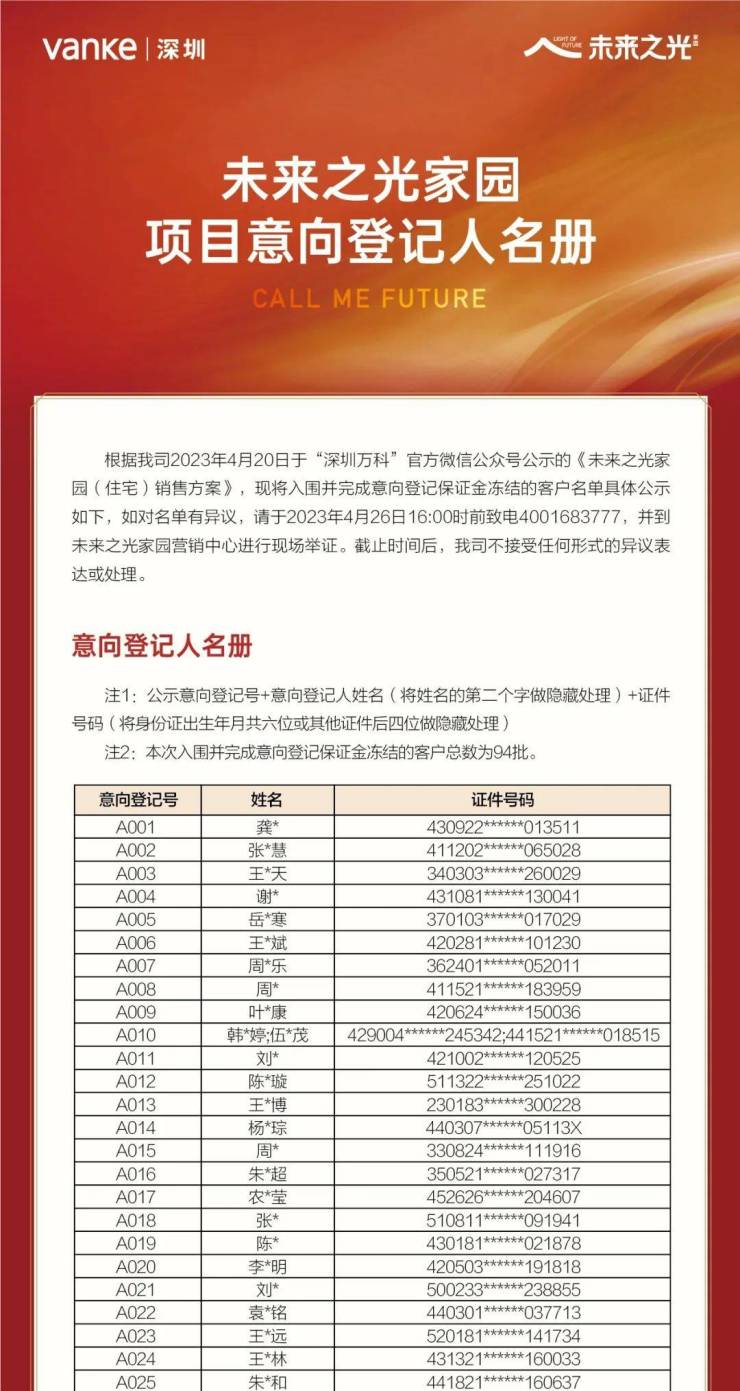 4月24日,宝安尖岗山万科未来之光发布诚意登记名册,共登记94批客户。项目将于4月26日在宝安公证处摇取选房顺序号。