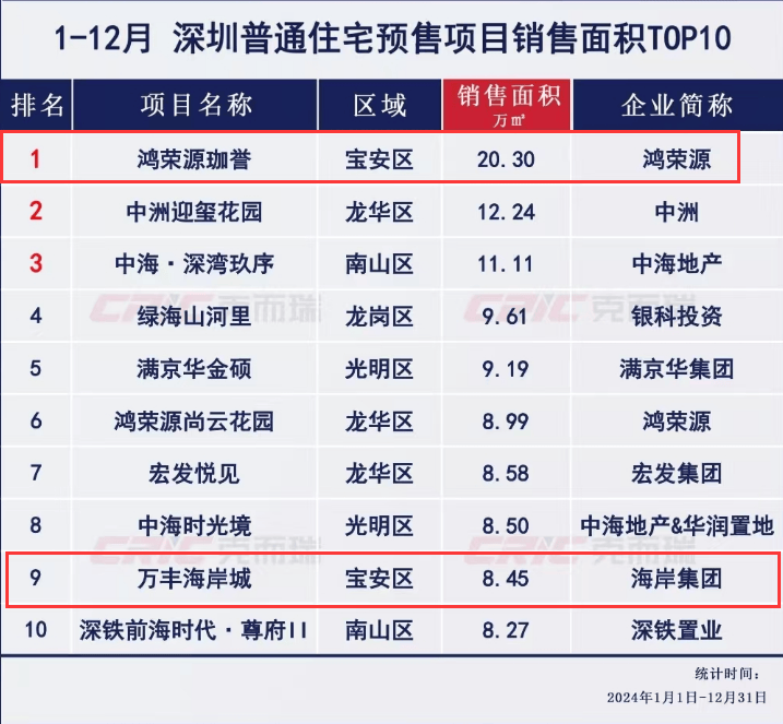 据克尔瑞统计深圳2024年普通住宅销售面积TOP榜,上述两个项目同属社区鸿荣源珈誉、万丰海岸城是宝安唯二上榜的项目。