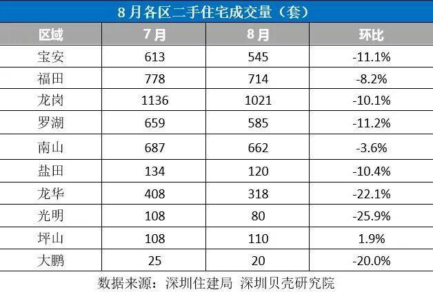8月坪山成交量110套,环比7月微涨了1.9%;而跌幅最大的数光明,跌了25.9%。