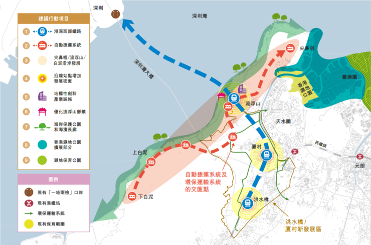 据了解,港深西部铁路连接香港洪水桥及深圳前海,由洪水桥站出发,在厦村及流浮山设车站,跨越后海湾经深圳湾再接驳前海,全长约18公里,香港段长约8公里。