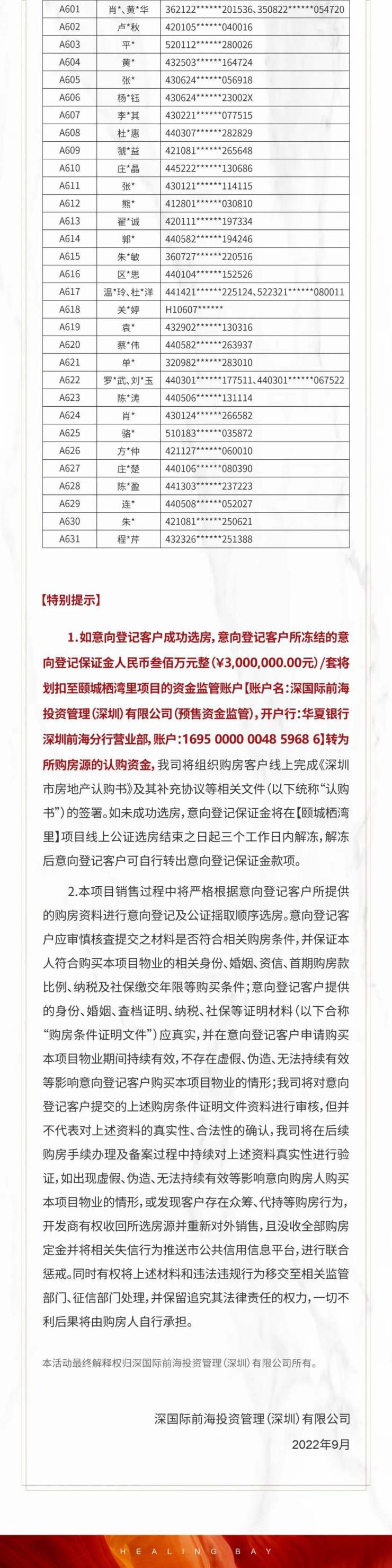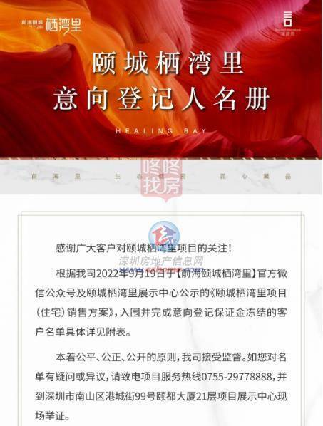 9月25日,位于前海的颐城栖湾里意向登记人名册公示,共登记约631批客户。9月26日,项目将在前海公证处公证摇号,9月28日将正式选房。