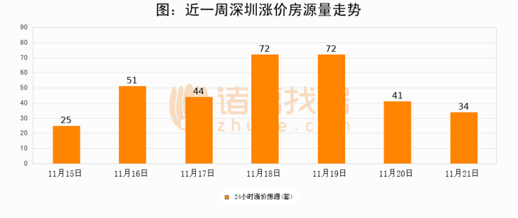 根据诸葛找房数据显示,深圳24小时涨价房源量为34套,较11月20日减少7套,环比下降17.1%。与此同时,涨价房源占比小幅回落,对于购房者来说是一个入市窗口期,购房者可抓住时机入市。