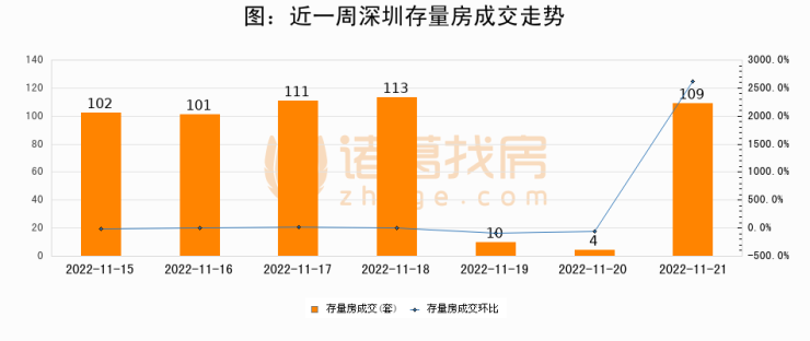 从存量房来看,2022年11月21日深圳存量房单日成交109套,比昨日增加105套,环比上涨2625%。从近一周存量房成交来看,深圳存量房日均成交套数为78套,其中11月18日成交量最高为113套,11月21日单日成交109套,高于近一周平均水平39.7%。