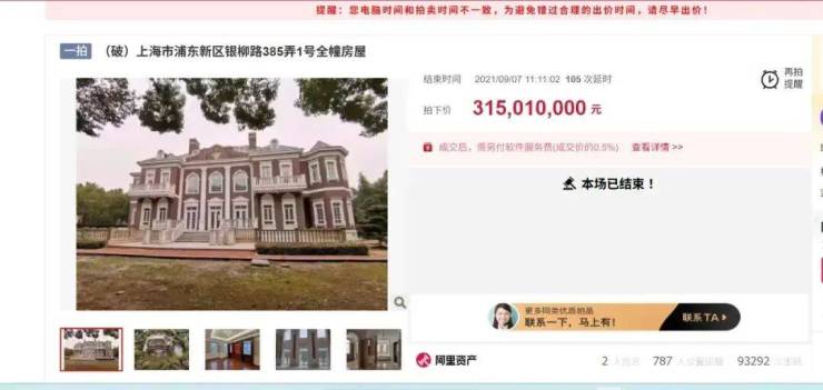 2、2021年9月7日破产拍卖上海市浦东新区银柳路385弄1号全幢,房屋1401.17 平方米(其中地下建筑面积528.61平方米),拍卖成交价格31501万元,这个是上海司法网络拍卖平台拍卖成交最贵单一住宅纪录。