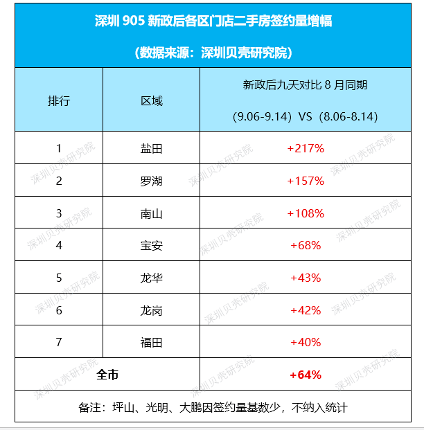 据深圳贝壳研究院监测,新政后九天(9月6日至9月14日),贝壳深圳合作门店二手房签约量较8月同期增长64%。