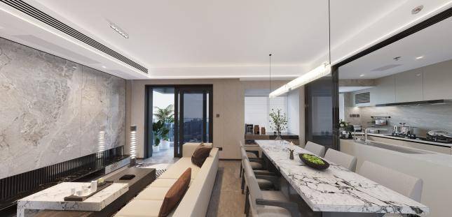 在建筑风格上,呈现出现代雅奢的设计理念,对材料和空间的质感要求很高,达到以简胜繁的效果,极具视觉的感官冲击力: