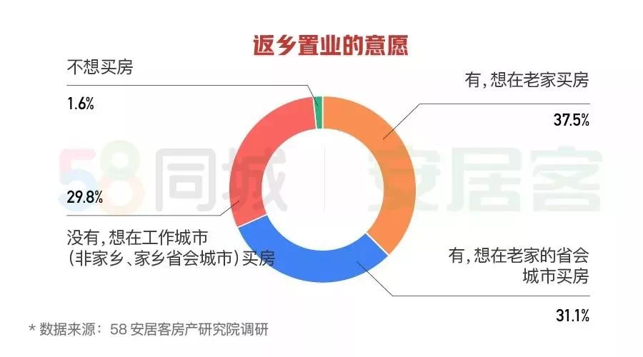 那和各位分享些现实的,既然你推荐我们回去卖房,那怎么做利益较大化。我个人也做了些总结,称为老家卖房攻略。首先,这里“卖房”是指各位盘整自己手上多余老家房子,这种才叫资产重新配置。如果你老家只有那么一套自住,也不是不行,就是务必想的明白,拿我朋友来说吧。他卖掉16年初老家淄博的一套自住别墅,换了苏州市区一套商品房,虽然我们都调侃他错过老家房改,但从经济账依然是盈利的多。关键他想到很明白了,卖掉少有房子,意味着和老家做了一次切割,如果没有什么特殊理由,包括过年,你会真正all in在你所押注那个城市。同时,最难不仅是自己的社会关系,而是父母能否接受去一个新城市扎根,我朋友父母这点上确实开明。然后,择机在老家其实没有那么重要,毕竟大家周期都是被棚改搅动的,现在没了,只要能卖出去,就是较好时机。虽然小阳春看起来会占便宜,但我觉得过年是较好的时机。之所以选择过年理由也简单,你平时不太会有着这么长假期回老家啊,起码给自己点时间,看看市场,了解行情,多找几个靠谱的中介吧。还有别忘了,还有一大波在返乡置业在路上了,58同城安居客的调研数据显示,国人返乡置业的意愿高达68.6%,这个数字在去年还只有52.7%。