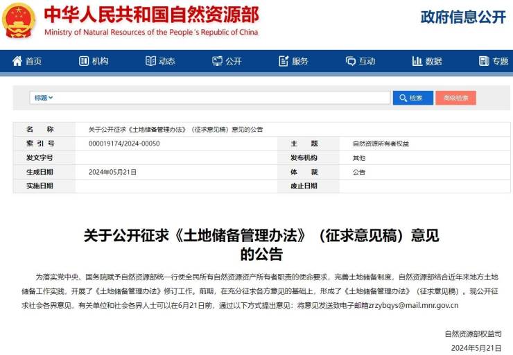 5月21日,自然资源部发布《土地储备管理办法》(征求意见稿)(以下简称办法),公开征求意见。