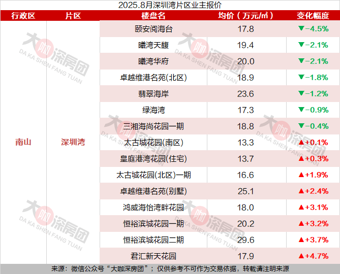 目前深圳湾报价最高的小区是恒裕滨城花园二期,目前业主报价29.6万元/㎡,较7月份上涨了3.7%。