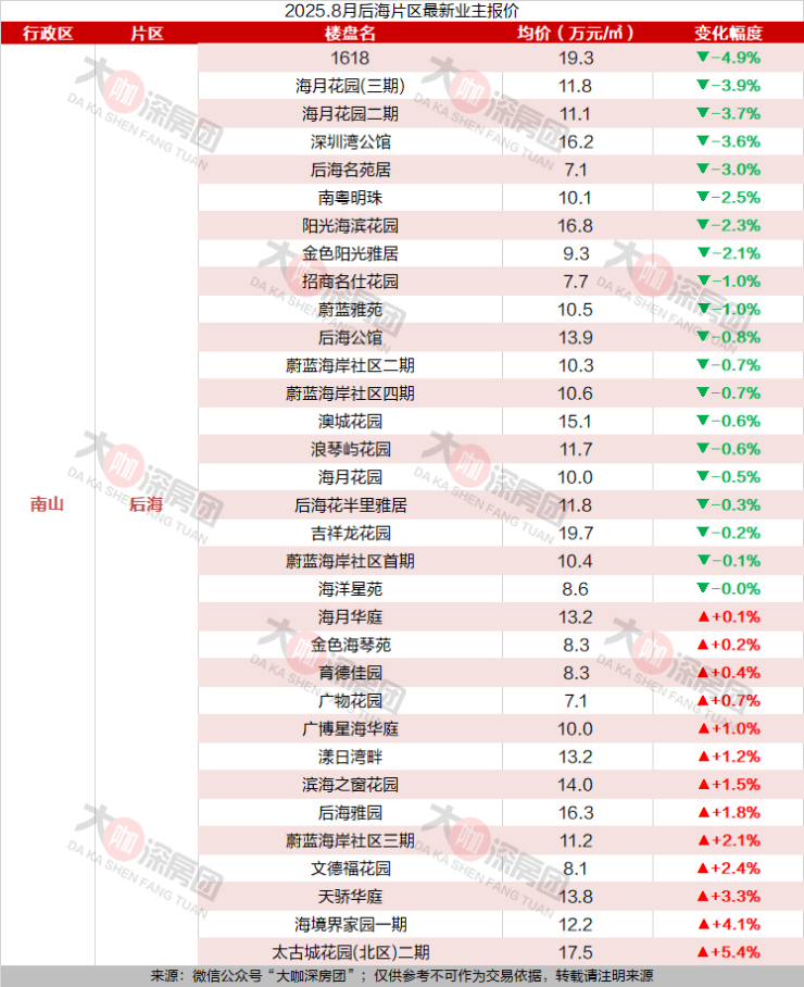 后海片区监测到的共33个小区,业主报价范围在7.1-19.7万元/㎡。