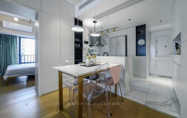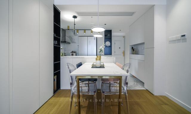 女主作为一名剁手达人,需要家里的储物空间能与她新淘回来的宝贝和谐相处,柜子自然要多做一些,但又受到空间限制,所以决定把客餐厅的柜子设计成隐藏式,柜面通体的白色增大了空间感,柜深也充分考虑了日后的储藏需求。它的储物量超抗打,而且还很漂酿捏。