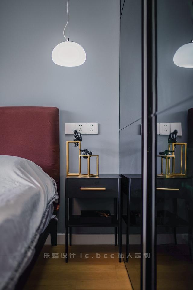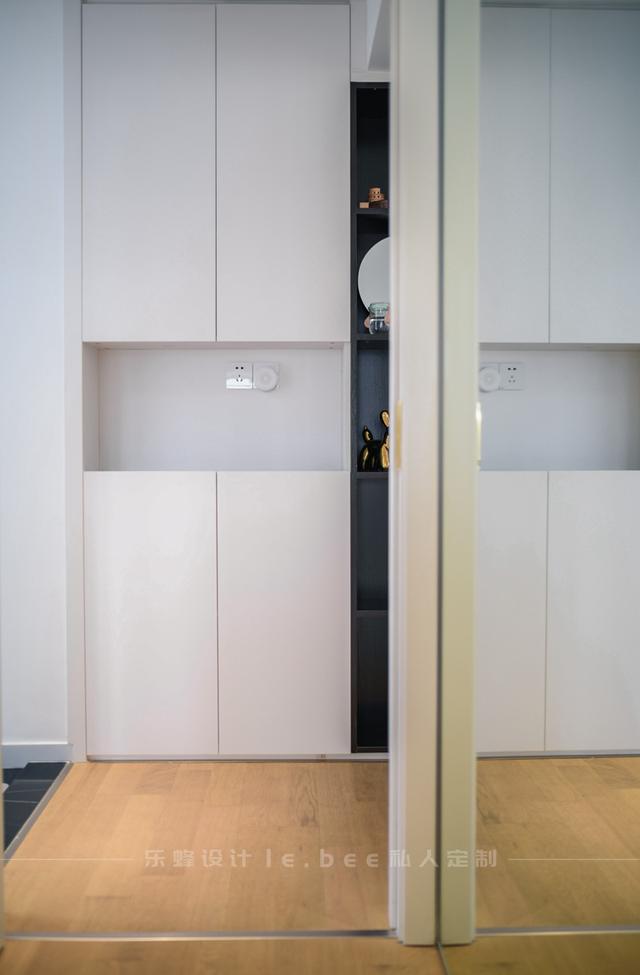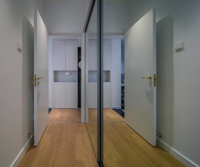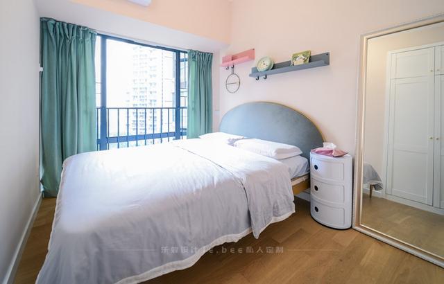 千万不要问女孩子对衣服鞋子还有包包的野心有多大,因为说出来怕刷新你的三观,哈哈!莫工特意在主卧增设了两个推拉门衣柜,一个与床并排放置,另一个则藏在入室门一侧。两衣柜的柜门均使用镜面玻璃造型,可当作全身穿衣镜,还能增大空间感,两全其美。