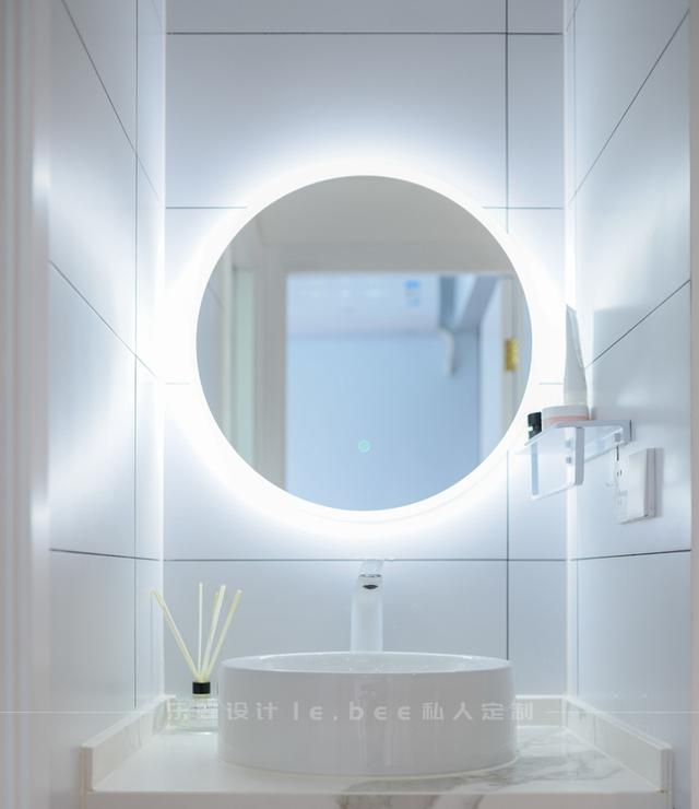 作为家里少有一个卫浴间,我们决不允许它的造型气势拉低整个家的颜值。从众多备选者里脱颖而出的台上盆,与圆形盥洗镜和冷调灯带的组合造型联袂出场,颜值超抗打。