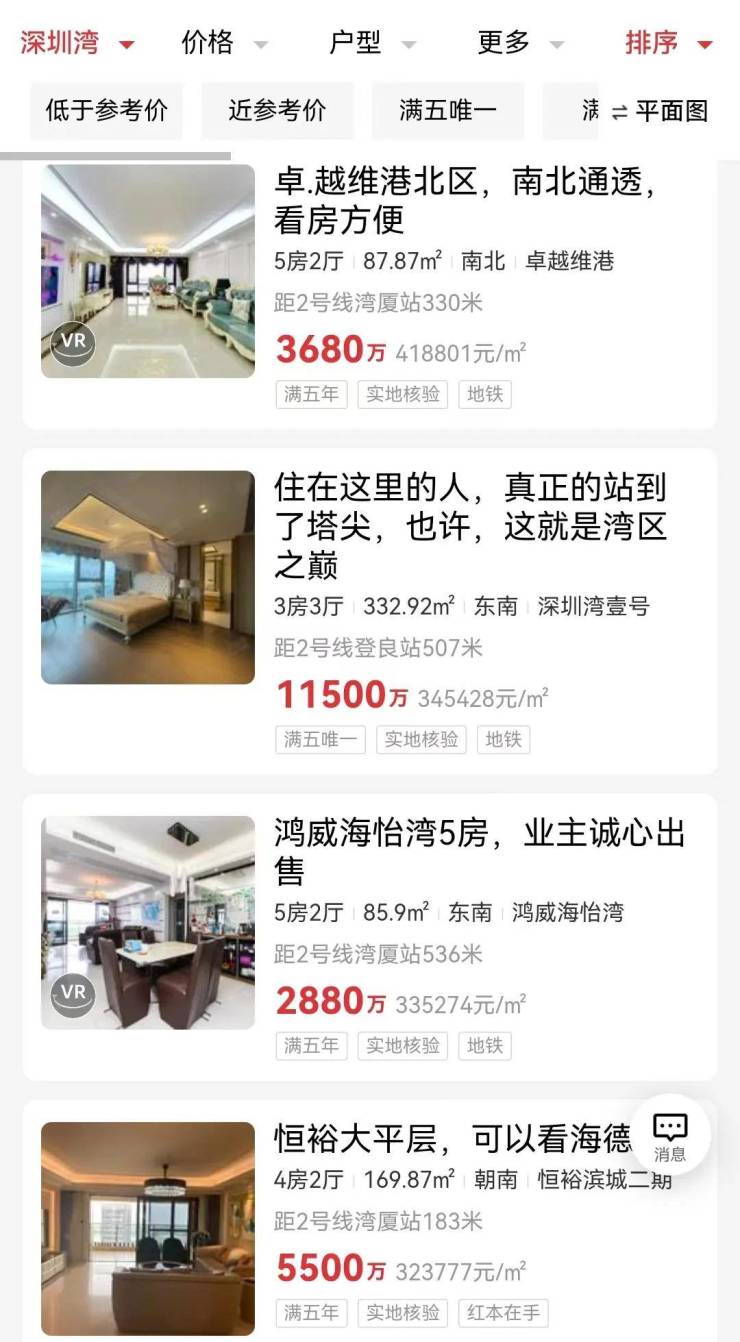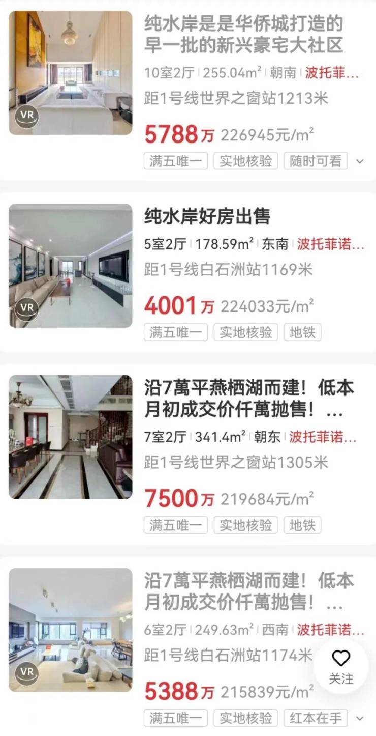 具体到个盘来看,现阶段挂牌价最高的是深圳湾片区的卓越维港87㎡5房,单价去到了41.8万/㎡;顶豪深圳湾壹号一套332.92㎡3房,单价34.5万/㎡;华侨城热盘新天鹅堡291.61㎡5房,也报出了27.4万/㎡的高价……