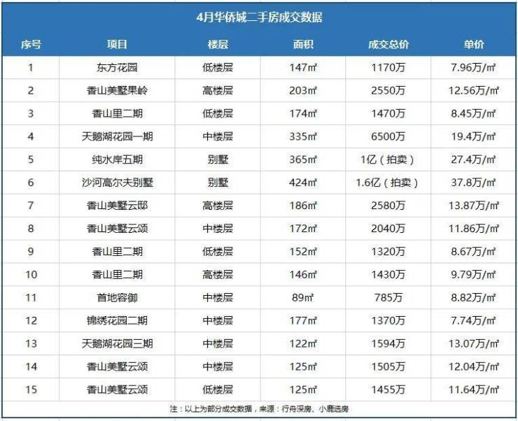 价格方面,4月有2套房源交易价格过亿,巧的是这2套亿级豪宅均出自华侨城,分别是沙河高尔夫别墅(1.6亿),纯水岸五期别墅(1亿)。