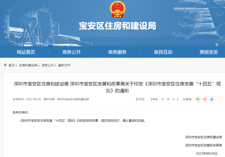 近日,宝安区住建局、宝安区发改委联合发布印发《深圳市宝安区住房发展“十四五”规划》(以下简称规划)。