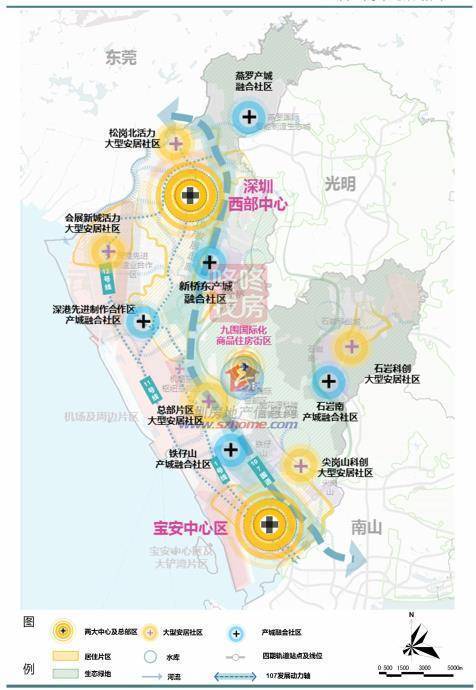 ● 构建“双中心、多组团、网络化”南北均衡、依山傍水的宜居空间格局,存量提升宝安中心区,加快建设深圳西部市级中心。