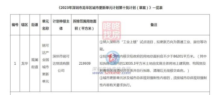 铭可达产业园城市更新单元,拆除范围用地面积219939平方米,规划容积861250平方米,其中住宅254330平方米。申报主体为深圳市铭可达物流有限公司,纳入深圳市“工业上楼”试点项目,拟更新方向为普通工业、居住等功能。
