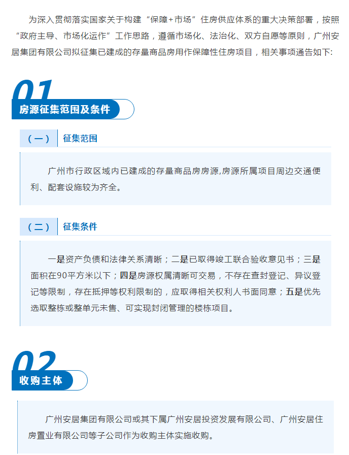 公告称,为深入贯彻落实国家关于构建“保障+市场”住房供应体系的重大决策部署,按照“政府主导、市场化运作”工作思路,遵循市场化、法治化、双方自愿等原则,广州安居集团有限公司拟征集已建成的存量商品房用作保障性住房项目。