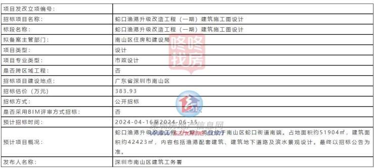 近日,蛇口渔港升级改造工程(一期)建筑施工图设计计划招标,预计招标时间为2024年4月16日至2024年6月15日。