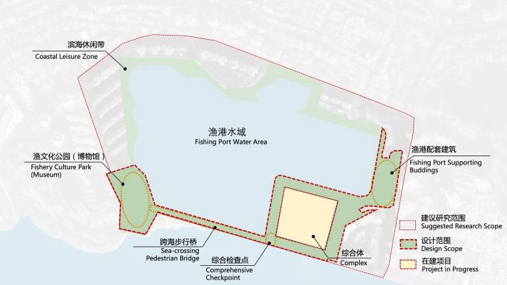 蛇口渔港升级改造工程方案设计国际竞赛内容包括城市设计研究、建筑设计(渔港配套建筑、跨海步行桥、渔文化公园)和景观设计等。