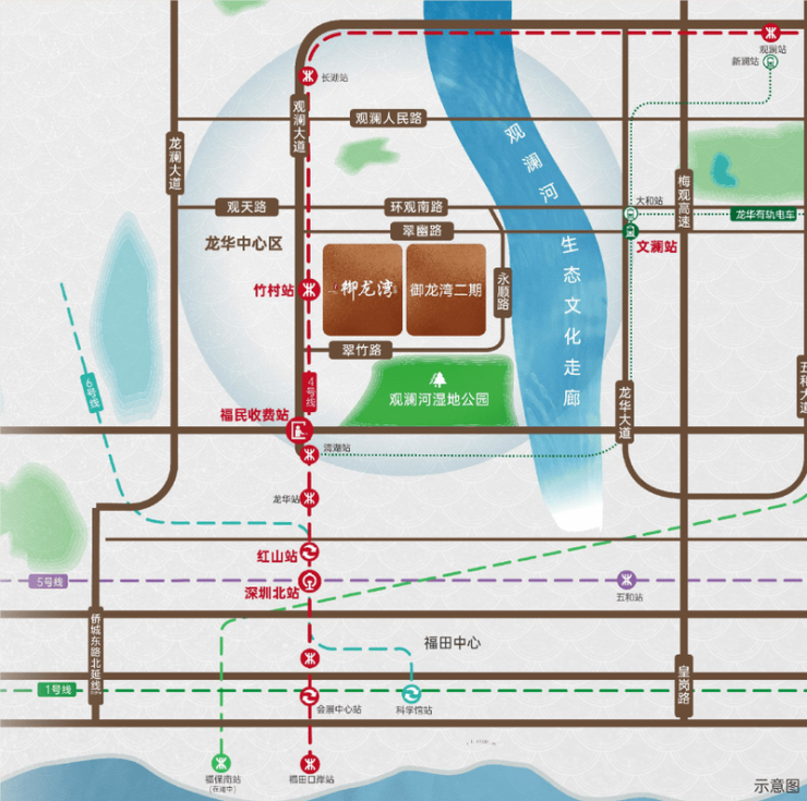 公园水岸双景观:紧邻观澜河生态走廊与观澜河湿地公园,推窗即见自然绿意。