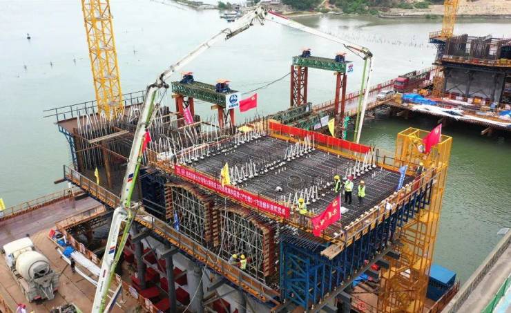 近日,深汕西高速改扩建长沙湾跨海特大桥预应力砼连续刚构箱梁12#主墩0-1节段顺利浇筑完成,标志着主墩进入上部结构施工,长沙湾特大桥挂篮悬浇施工正式拉开序幕。