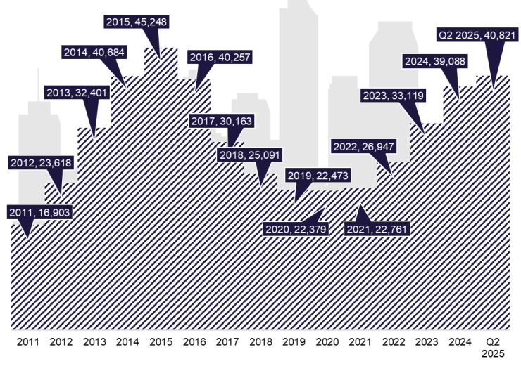 截止2025年上半年,全国商品住宅待售面积40,821万平方米,较一季度减少1,337万平方米,库存压力稍有缓解,但超4亿平方米的库存总量,仍处于历史高位。