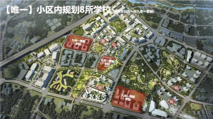 建设范围内包含5所幼儿园和3所九年一贯制学校、约40万㎡壹方天地商业、医疗卫生用地、社会福利用地、5大城市公园。