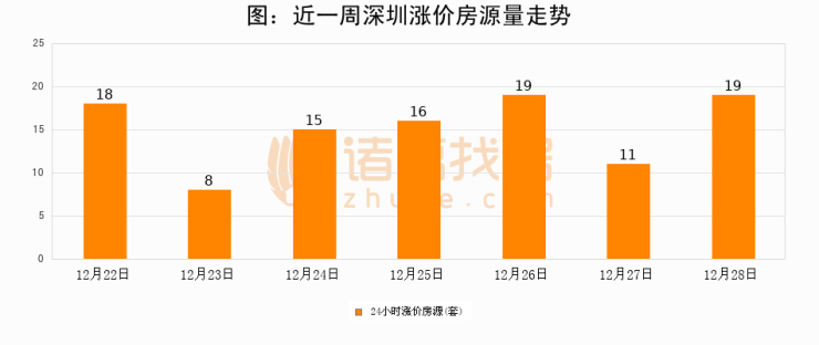 根据诸葛找房数据显示,深圳24小时涨价房源量为19套,较12月27日增加8套,环比上涨72.7%。与此同时,涨价房源占比小幅扩大,业主信心有所提升。