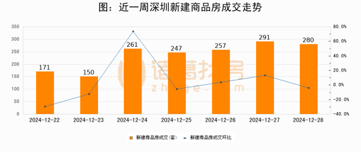 根据深圳市住房和城乡建设局数据显示,2024年12月28日深圳新建商品房成交280套,较昨日减少11套,环比下降3.8%