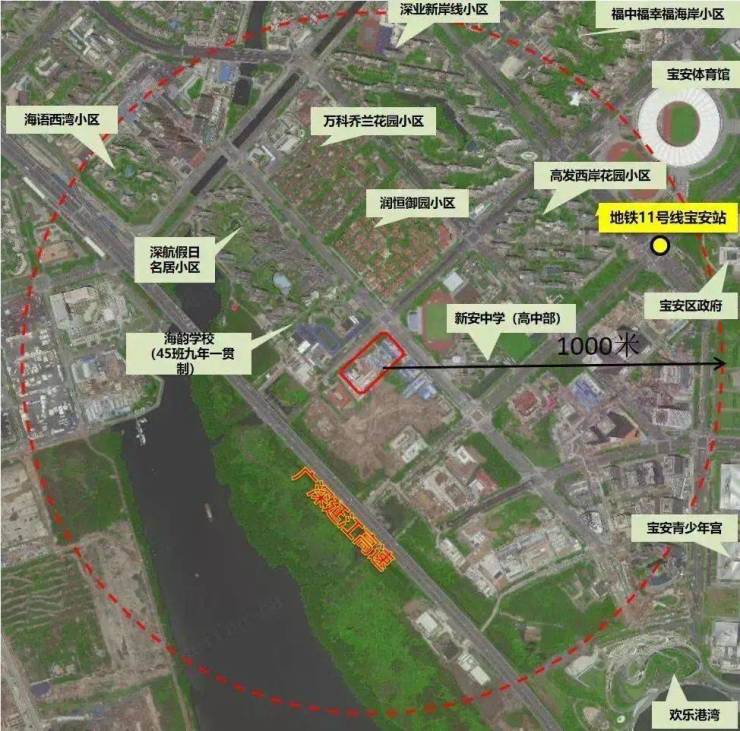 地块北面是海韵学校、深航福利房深航假日名居,西面就是大铲湾,南面是湾区产业投资大厦,东面为新安中学(集团)高中部。
