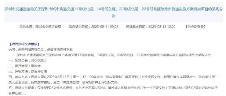 近日,深圳市交通运输局发布《深圳市城市轨道交通13号线北延、14号线东延、20号线北延、22号线北延等跨市轨道实施方案研究项目的采购公告》。