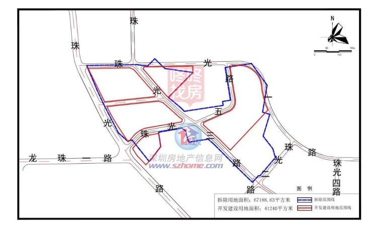 桃源街道珠光村旧改一期B项目实施主体拟确认为深圳市京基投资有限公司,一期内可分为A、B项目实施,其中B项目拆除范围用地面积67188.6㎡,规划容积254764㎡。
