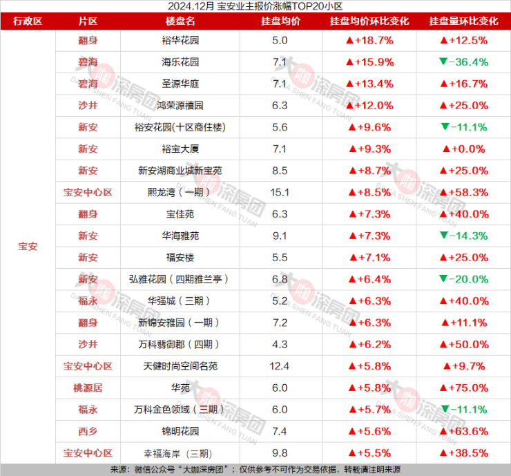 12月宝安区涨幅最高的小区,是位于翻身片区的裕华花园,目前挂盘均价为5.0万元/㎡,环比上涨18.7%。