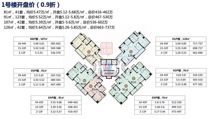 本批次房源位于东地块的二期1号楼,45层高,主打建面约81-91-107-126㎡,共计250套。