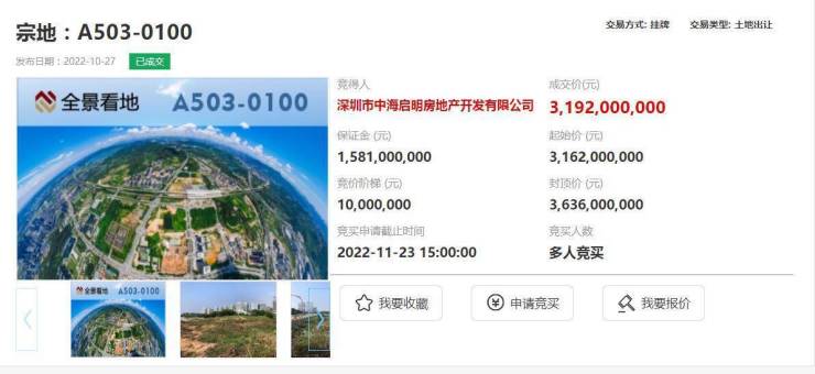 其中,位于光明凤凰街道的 A503-0100宗地被中海竞得(深圳市中海启明房地产开发有限公司)最终成交价为319200万