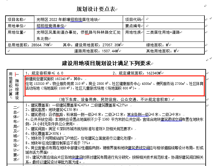 根据规划显示,项目土地面积28564.79平方米,建面162340平方米,容积率≤6,其中住宅152030平方米、物业服务用房310平方米、商业2800平方米、社区健康服务中心4500平方米、便民服务站2700平方米、社区体育活动场地(场地面积1500平方米)、社区儿童游戏场地(场地面积600平方米)。