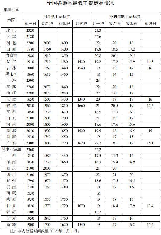 1月2日,人社部官网发布了全国各地区最低工资标准情况(截至2023年1月1日),上海月最低工资标准达到2590元,为全国最高。14个地区月最低工资标准达到2000元及以上。