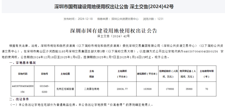 12月18日,深圳公共资源交易中心正式发布龙岗大运中心G01045-0200宗地公示挂牌公告。