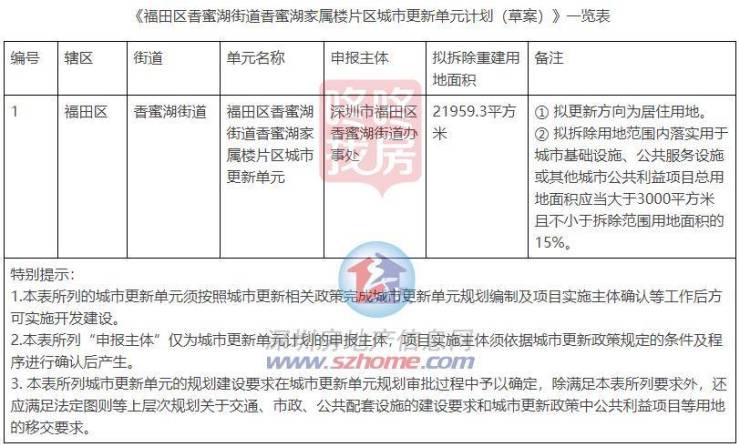 6月25日,福田区城市更新和土地整备局发布《福田区香蜜湖街道香蜜湖家属楼片区城市更新单元计划(草案)》。
