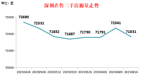 根据公开在售二手房源量数据统计,截至2025年6月16日,全市共有71,831套有效二手房源在售,较上周减少510套。其中宝安较上周减少151套,有效在售13,175套,福田较上周减少127套,有效在售10,190套,龙岗较上周减少113套,有效在售18,494套。