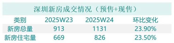 据深圳市房地产信息平台数据,2025年第24周全市新房(预售+现售)成交量出现波动回升。