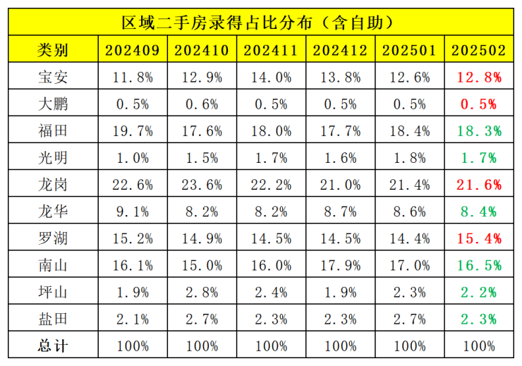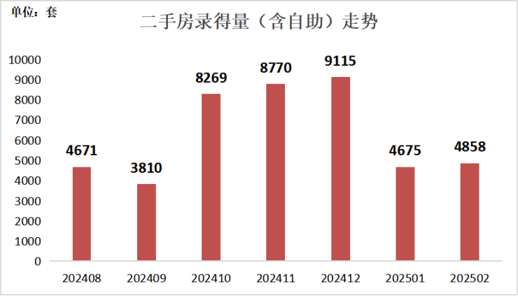 根据深房中协统计,2025年2月全市二手房录得【本文录得量系指深房中协以二手房买卖合同发起时间为口径统计的数据,并非最终成交套数】4,858套,环比增长3.9%,同比增长102.5%。春节假期结束复工后,二手房市场热度快速回温,录得量呈现持续增长态势。